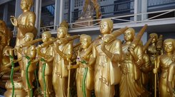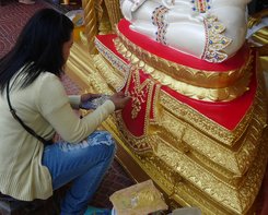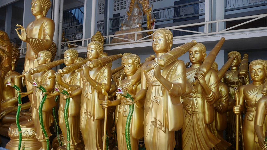 Kaum habe ich diese verlassen, gerate ich erneut ins Staunen. Denn um die nächste Ecke herum entdecke ich eine Straße von Läden mit Buddhafiguren in allen Größen und Farben. Hier ist das Viertel, in dem diese Figuren in Bangkok hergestellt werden, erklärt mir Reiseleiterin Phum. Was für den Thailänder von Kaufinteresse ist, erzeugt bei mir als Besucher der Metropole den Reiz eines Museums. Ob groß und golden oder klein und filigran verarbeitet, alle Buddhas, Tempelwächter und Figürchen buddhistischen Glaubens finden sich hier. Reisende mit Hang zum Kitsch und Sammelleidenschaft dürften hier ihre wahre Freude haben.