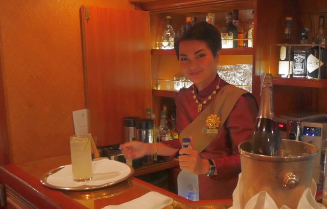 Eine Fahrt mit dem Eastern Oriental Express wäre kein Erlebnis, träfe man nicht Mitreisende und Persönlichkeiten, denen man an keinem anderen Ort der Welt so nah begegnen könnte wie hier. Da ist zunächst mal der aus Singapur stammende Piano-Man Peter Consigliere, der seit 20 Jahren die Reisenden abends in der Bar mit Swing, Jazz und Evergreens unterhält und für eine mondäne Stimmung im Stil der 20er Jahre sorgt. Immer stilecht gekleidet mit Fliege und Tuxedo, passt er ausgesprochen gut in das Ambiente. Seine raue Stimme, mit der er seine Stücke begleitet, erweckt das Gefühl, man befinde sich in einer New Yorker Bar, in der Louis Armstrong sein Stelldichein gäbe. Seine Lieder reißen die Zuhörer mit, heben die Stimmung, Ausgelassenheit breitet sich rasch aus.