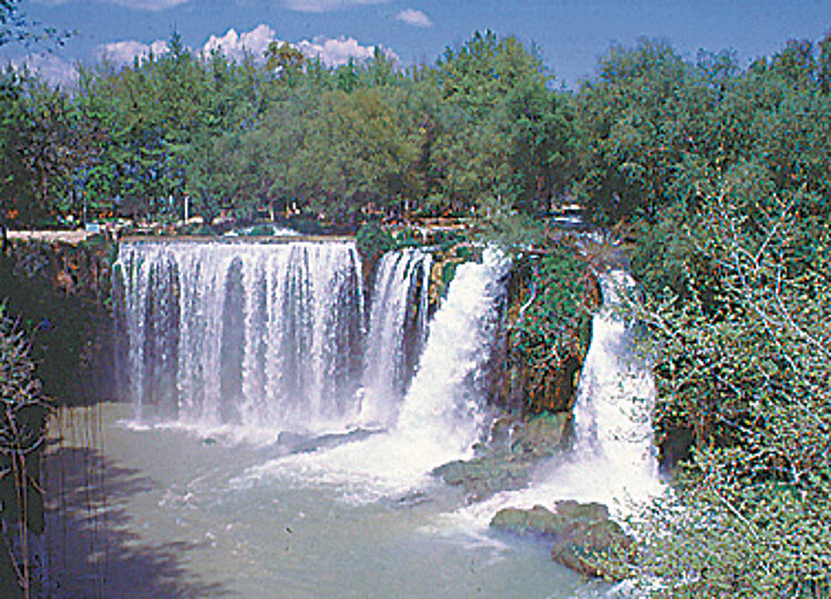 Landschaftlich orientierte Ausflüge führen per Boot zu den dicht bei Antalya ins Meer stürzenden Unteren Düden-Wasserfällen und per Auto oder Bus zu den 11 km landeinwärts gelegenen oberen Düden-Wasserfällen; außerdem in das Gebirge oder mit dem Boot entlang der zerklüfteten Küste in Richtung Kemer und Finike. Gut erreichbar von Antalya aus sind die großartigen antiken Stätten Termessos (30 km nordwestlich) und in östlicher Richtung Perge (18 km) und Aspendos (40 km) Mit dem schönsten Meeresblick weit und breit kann die sehr alte, von pisidischen Bergstämmen errichtete Burgfestung Termessos aufwarten. Alexander d. Gr. verzichtete 334 v. Chr. auf einen Angriff auf die stark befestigte und schwer zugängliche Stadt. Seine Blütezeit erlebte Termessos im 2. und 1. Jh. v. Chr. In spätrömischer Zeit wurde die Stadt nach einem Erdbeben von den Bewohnern verlassen. Perge war eine der größten Städte Pamphyliens und eine der ersten Christengemeinden Kleinasiens. Der Apostel Paulus soll hier seine erste Predigt gehalten haben. In dem großen Ausgrabungsfeld kann man die Besichtigung auf das römische Stadttor mit zwei runden Türmen, die frühere Arkadenstraße mit zahlreichen Säulen, das gut erhaltene Stadion, die Agora, die Thermen und das in den Hang eines Hügels hineingebaute Theater beschränken. Aspendos besitzt eines der am besten erhaltenen Theater. Die hervorragende Akustik wird vor allem durch die muschelförmige Ausbuchtung der Sitzstufen erreicht. Auf dem Akropolishügel von Aspendos sind noch Überreste der Agora, der Stadtbefestigung und eines Aquädukts erhalten.