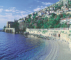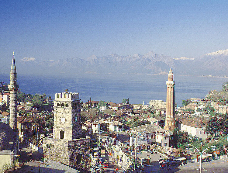 Für viele gilt Antalya als die schönste Stadt am Mittelmeer und dazu noch die schönste Großstadt der Türkei. Trotz der Hochhäuser und Wohnblocks in der Neustadt besitzt Antalya einen sehr schönen Kern mit verwinkelten Gässchen, alten Häusern mit von Weinreben umrankten Innenhöfen und den typischen Holz-Erkern, die sich in den schmalen Gassen beinahe berühren. Am Westrand der Pamphylischen Ebene gelegen, die dort auf die mächtigen Gebirgsketten des lykischen Taurus trifft, liegt Antalya am Rande einer etwa 50 m hohen Kalksteinterrasse, die steil ins Meer abfällt. Besonders während der letzten Jahre hat sich die Stadt aufgrund ihrer verkehrsgünstigen Lage und der zahlreichen antiken Stätten in der Umgebung zu einem Touristenzentrum entwickelt, ohne jedoch allzuviel von seinem natürlichen Charme zu verlieren. Eine gute Bademöglichkeit in Antalya ist der Konyaaltı-Strand westlich der Stadt, ein kilometerlanger Kiesstrand, z. T. gesäumt von Restaurants und Cafés. Ca. 12 km östlich der Stadt zieht sich der ebenfalls mehrere Kilometer lange Lara-Strand. Anreise per Minibus.