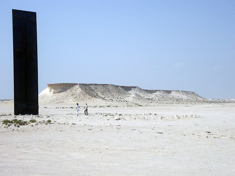Die Kunststationen beginnen schon am Wüstenrand. 80 Kilometer nördlich der Hauptstadt hat der amerikanische Bildhauer Richard Serra vier stählerne Stelen in den Sand gerammt. 14 Meter hoch ragen die rotbraunen Kolosse in der tristen Einsamkeit, die nur mit Geländewagen zu erreichen ist. Über einen Kilometer lang erstreckt sich die kühne Installation „East West/West East“ durch das karge von Dünen durchzogene Terrain des Naturreservats Brouq. Früher belebte die Oryxantilope als größtes Landtier auf freier Wildbahn die spärliche Vegetation. Dann wurde die Rasse ausgerottet. Seit 1980 bemüht sich die Oryx-Farm um die Wiederaufzucht. Doch das Programm braucht Zeit. Noch scheuen diese Tiere die menschliche Nähe. Nur ein paar neugierige Strauße recken ihre langen Hälse.