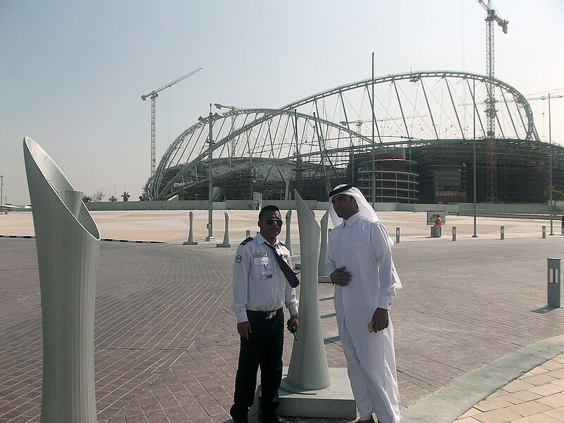 Das Stahlgerippe auf der Großbaustelle erinnert an eine Riesenachterbahn. Nur die Loopings fehlen noch. Aber es wird keine nervenkitzelnde Kirmesattraktion was dort entsteht, sondern ein Stadion für die Fußball-Weltmeisterschaft 2022 im Emirat Katar. Fußball gehört seit 60 Jahren neben Kamelrennen zu den beliebtesten Sportarten der Saudis im aufstrebenden Wüstenstaat am Persischem Golf. Von den 3,6 Millionen Einwohnern leben 1,7 Millionen in der Hauptstadt Doha.