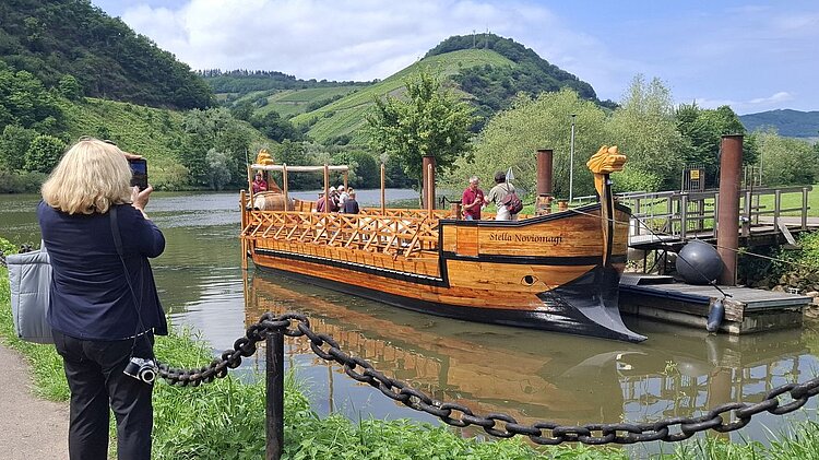 Auf dieser Route bietet zum Beispiel das Römerzentrum „Neumagen-Dhron“ als ältester Weinort Deutschlands einen archäologischen Rundweg mit Info-Schautafeln und den Repliken von Grabreliefs. Der Fundort antiker Kostbarkeiten ist zugleich Heimathafen für das Römerschiff „Stella Noviomagi“. Ausflugsfahrten mit der knapp 18 Meter langen und vier Meter breiten originalgetreuen Holz-Rekonstruktion auf der „Mosella“, so der lateinische Name für die Mosel, schippern vorbei an Spitzenlagen auf blauem Schieferboden, auf dem fruchtige Riesling-Weine gedeihen. Die 66 Hektar große Weinlage „Piesporter Goldtröpfchen“ hat hier ihr Riesling-Terrain. Vom Wasser aus kann zudem am Ufer das Naturdenkmal „Moselloreley“ als steilster Felshang der Flussschleife bestaunt werden.