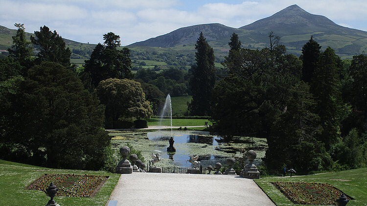 Umrahmt von alten Bäumen, die einst in fernen Ländern gesammelt wurden, fügen sich, geschmückt mit Statuen und Wasserspielen, die Gärten derjenigen Wingfields mit grünem Daumen zu einem 19 Hektar großen Gesamtkunstwerk: der ummauerte Garten mit Irlands längster Staudenrabatte, der Haustierfriedhof inmitten einer Löwenzahnwiese, wo die Kuh Eugenie, Cockerspaniel Jack und andere geliebte Vierbeiner der beiden Familien zur letzten Ruhe gebettet wurden, der Japanische Garten mit seiner Pagode zwischen Azaleen und asiatischem Ahorn, die Grotte aus versteinertem Torfmoos und das Turmtal. Vor allem aber der Italienische Garten, „für dessen Bau 100 Männer über zwölf Jahre brauchten“, wie Chefgärtner Alex Slazenger weiß. Der Architekt Daniel Robertson hatte die terrassierte Anlage über dem Tritonsee Mitte des 19. Jahrhunderts geschaffen. Und den sensationellen Blick auf den kahlen Gipfel des Sugar-Loaf-Bergs gab die Natur als wilde Hintergrundkulisse gratis dazu.