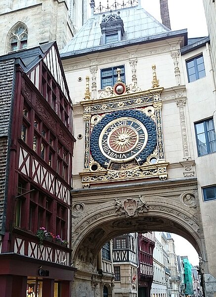 Vom Place de la Cathédrale aus führt die Rue de Gros Horloge auf ein weiteres gleichnamiges Kunstwerk zu. Le Gros Horloge von Rouen ist ein Meisterwerk der Uhrmacherkunst und zählt zu den ältesten astronomischen Uhren der Welt. Den einzigen Zeiger der Uhr – ein Stundenzeiger – ziert ein Schäfchen, das Wappentier der Stadt. Die Wochentage werden von den zugehörigen sieben Göttern in ihren Triumphwagen dargestellt: Lundi/Montag = Diana (u.a. Göttin des Mondes), Mardi/Dienstag = Mars (Gott des Krieges), Mercredi/Mittwoch = Merkur (Götterbote), Jeudi/Donnerstag = Jupiter (Gottvater), Vendredi/Freitag = Venus (u.a. Göttin der Liebe), Samedi/Samstag = Saturn (u.a. Gott der Aussaat), Dimanche/Sonntag = Appollo (u.a. Sonnengott). Über dem Ziffernblatt wird außerdem durch eine Kugel der Stand des Mondes angezeigt. Bei Vollmond glänzt diese silbern, bei Neumond ist sie schwarz.