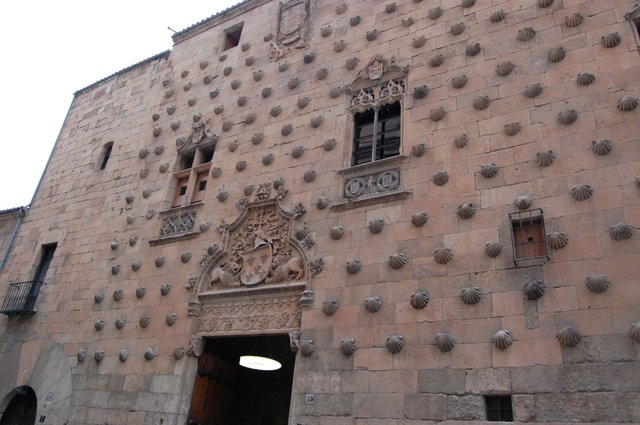 Das Hauptportal der Universität ist mit zahlreichen Skulpturen und Dekor im Stil der spanischen Frührenaissance, dem so genannten Platereskstil geschmückt. Ein Totenkopf mit einem Frosch symbolisiert die Ausschweifungen im Leben, die nach dem Tod gesühnt werden. Überall in Salamanca kann man deshalb Froschfiguren in den verschiedensten Variationen erwerben – unter Studenten ein beliebtes Geschenk. Bekannt ist auch das Haus der Muscheln (La casa de las conchas), ein ebenfalls im Platereskstil erbauter Stadtpalast, dessen Fassade mit mehr als 400 Muscheln aus goldgelbem Sandstein, dem Symbol der Pilgerschaft nach Santiago de Compostela, geschmückt ist.