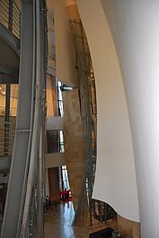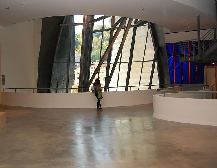 Mit dem kanadisch-amerikanischen Architekten Frank O’Gehry gewann ein Vertreter des dekonstuktivistischen Baustils das Rennen um die architektonische Gestaltung des Museums. O’Gehry schaffte ein skurriles Gebäude, das als eines der außergewöhnlichsten Bauwerke unserer Zeit gilt. Den Mittelpunkt bildet ein gläsernes Atrium mit einem Oberlicht aus Metall in Form einer überdimensionalen Blume. Charakteristisch für das ovale Gebäude mit lang gezogenen, herausragenden Dachteilen ist die Anordnung in sich verdrehter Elemente aus Titan im Fischschuppen-Muster. Kontrastiert werden diese mit rechtwinkligen Kalksteinblöcken, in die ebenfalls gebogene Formen aus Titan eingelassen sind. So bietet das 24.000 qm große Museum einen gigantischen Anblick vor der Stadtkulisse Bilbaos.