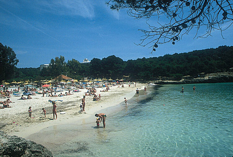 Eigentlich gibt es in Cala d'Or gar keinen richtigen, zusammenhängenden Ortsstrand! Das macht aber nichts, denn stattdessen hat man die Wahl zwischen fünf kleinen Badebuchten, die alle vom Ort aus problemlos erreichbar sind. Im Einzelnen sind das (von Nord nach Süd): die Cala Ferrera mit 1.700 qm, die Cala Esmeralda mit 450 qm, die Cala Gran mit 2.350 qm, die Cala d'Or mit 450 qm und die Cala d'Egos mit ebenfalls 450 qm nutzbarer Fläche. Zwar variieren die Buchten stark in der Größe, aber eines haben sie alle gemeinsam: herrliches, türkisfarbenes Wasser und tiefen, weißen Sandstrand. Der Service ist überall hervorragend. Das besondere Plus am noblen Ferienort Cala d'Or: Die Häuser überragen nirgends die Baumgrenze und fallen deshalb nicht störend ins Auge.