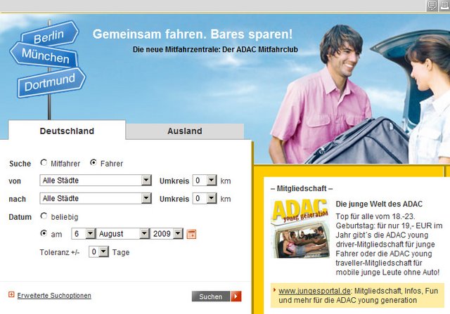 Unter dem Motto „Gemeinsam Fahren. Bares sparen“ startet der ADAC ab sofort eine kostenlose Vermittlungsplattform zum Mitfahren und Mitnehmen und bietet damit eine wirtschaftliche Alternative zum Individualverkehr. In Kooperation mit „mitfahrgelegenheit.de“ stehen den Nutzern des Mitfahrclubs 150.000 bis 20.000 aktuelle Fahrten und Gesuche zur Verfügung.