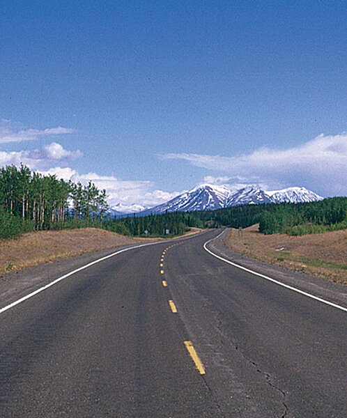 Der Alaska Highway von Dawson Creek (British Columbia) nach Fairbanks (Alaska) führt auf dem Gebiet des Yukon Territory über mehrere kleinere Pässe, vorbei an Gebirgstälern mit eindrucksvoller Szenerie, Wäldern und Seen. Über 50 km führt der Highway zunächst am Ufer des Teslin entlang. Am Ende des Sees erlaubt die Schotterpiste der South Canol Road bei Johnson’s Crossing einen Abstecher nach Norden in nahezu unberührte Wildnis. Wie lange noch, weiß jedoch niemand zu sagen: Die Fahrbahn wird nicht mehr gewartet und verfällt. Da tröste man sich in der Raststätte mit einer der Landesspezialitäten: Cinnamon Bun (ein lockeres Hefe-Zimt-Rosinen-Staubzuckergebäck). Bei der nächsten Raststätte, „Cristal Palace“ bei Jokes Corner, erlaubt die Schotterstraße des kurzen (55 km) Highways Nr. 8, den Rundkurs um eine Fahrt nach Carcross zu erweitern.