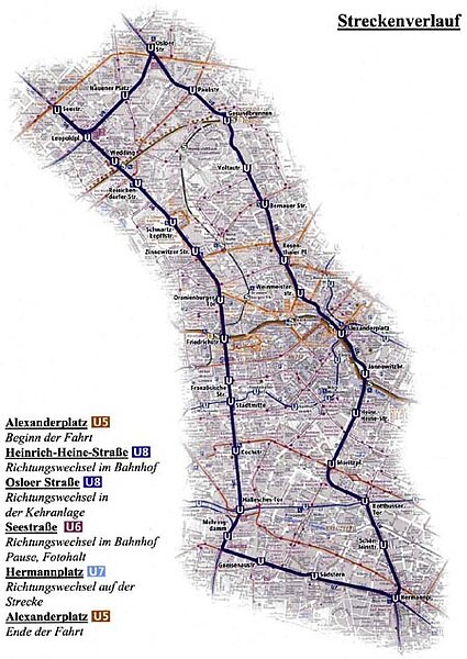 Zweieinhalb Stunden dauert die Fahrt, die vom Bahnhof Alexanderplatz zunächst Richtung Kreuzberg Neukölln führt. Die Augen benötigen einige Zeit, um sich an das Licht hier unten zu gewöhnen. Doch dann kann man Dinge auf der 23 Kilometer langen Rundfahrt entdecken, die man bei einer normalen U-Bahn-Fahrt nicht sieht: überdimensionale U-Bahn-Garagen, weit verzweigte Röhrensysteme, Aufstellanlagen und Wendestellen. Die Logistik unter Berlins Straßen und Wohnhäusern ist enorm. Übrigens: So richtig ist unter Tage die Trennung der beiden Stadthälften noch nicht beseitigt. „Übergang“-Schilder weisen auf den ehemaligen Grenzverlauf hin. Als ob dies heute noch eine Rolle spielen würde.