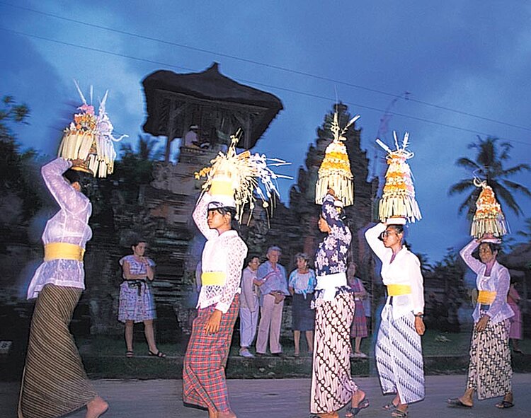 Im Gegensatz zur muslimischen Mehrheit Indonesiens bekennen sich 95 Prozent der Balinesen zum Hinduismus. Die übrigen 5 Prozent sind Buddhisten, Moslems oder Christen. Der balinesische Hinduismus hat sich jedoch zu einer eigenständigen und unverwechselbaren Variante entwickelt. Die Balinesen glauben an die Beseeltheit der Natur und die Vergöttlichung der Ahnen. Auf Bali wird der Alltag stärker von der Religion geprägt als auf anderen indonesischen Inseln. Sie sehen das Leben als einen dauernden Kampf zwischen guten und bösen Mächten an, deren Vertreter Götter und Dämonen sind. Mit Opfergaben versucht man diese freundlich zu stimmen. Die vielen Rituale, die täglichen Tempelzeremonien, Opferriten, Prozessionen und Tempeltänze stehen alle im Zeichen des Kontaktes mit den Göttern. Auch die bösen Mächte, die Dämonen spielen eine große Rolle: Die Bevölkerung versucht ihren Einfluss mit Opfergaben zu mindern oder ganz aus ihrem Leben zu verbannen.