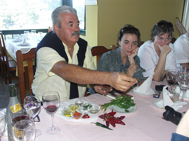 Wir hören kaum hin, was Isidro uns sagen will. Palmen, Drachenbäume, Kandelaberkakteen und nochmals Kakteen, ein kleiner Lorbeerwald und eine Steilwand veranschaulichen ein wenig die Vielfalt der verschiedenen Vegetationsstufen. Isidro hat uns trotzdem auch etwas aus seinem eigenen Garten mitgebracht, denn Liebe geht bekanntlich durch den Magen: Die Zutaten für eine scharfe Sauce, von der man sich gern vorstellen würde, dass schon die kanarischen Ureinwohner sie mit den salzigen Runzelkartoffeln gegessen hätten. Stimmt natürlich nicht, aber heute kennt das Rezept fast die gesamte globale Urlaubergemeinde. Allerdings nehmen sich die meisten bereits fertig abgefüllte Gläser mit nach Hause. Wir nicht: Für Mojo verde reibt man im Mörser 2 Bund Koriander, 5 Knoblauchzehen, 2-3 Prisen Meersalz, 1 Chilichote und verrührt dies mit 0.5 Liter Olivenöl. Für die pikantere rote Variante (Mojo rojo oder salsa picante) braucht man 3-4 rote Pepperoni, eine ganze Knoblauchknolle, Paprika und gerösteten Kümmel.