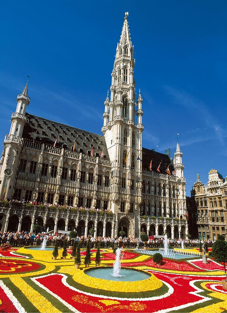 Anlässlich der Veranstaltung öffnet das Brüsseler Rathaus von Freitag bis Sonntag, 9 bis 23 Uhr, seine Türen. Das Blütenmeer kann dann auch von oben betrachtet werden.