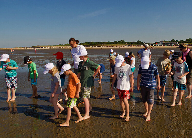 Gelernt wird in einem Zelt am Strand und auf dem Stundenplan steht das Weltnaturerbe Wattenmeer. Im „Blauen Klassenzimmer“, das in diesem Jahr zum 16. Mal in Cuxhaven stattfindet, erhalten Kinder tiefe Einblicke in die Welt des Meeres. Als Anschauungsmaterialien dienen mehr als 60 Exponate unterschiedlicher Tier- und Pflanzenarten. Höhepunkt des Unterrichts ist eine Exkursion, die – ausgerüstet mit Grabeforke und Becherlupe – auf den Spuren von Wattwurm und Strandkrabbe ins trocken gefallene Watt führt.