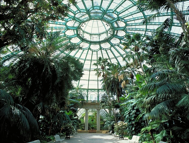 Seit über 100 Jahren öffnen die königlichen Gewächshäuser zu Laeken, nördlich von Brüssel, einmal jährlich für wenige Wochen ihre Tore. Ein knapp ein Kilometer langer Spaziergang führt durch Glasgalerien und Pavillons mit zahlreichen Palmenriesen, Blumenteppichen und exotischen Pflanzen. Der Palmengarten aus Glas und Stahl besteht aus einem breiten gläsernen Rundgang und einer Kuppel mit einer Höhe von 25 Metern, die von 36 Säulen getragen wird. Bis an die Decke reichen die mächtigen Dattelpalmen. In den Felswänden des Wintergartens blühen verschiedenfarbige Orchideen. In der fast hundert Meter langen Orangerie gedeihen über 200 Jahre alte Zitrus- und Lorbeerbäume.