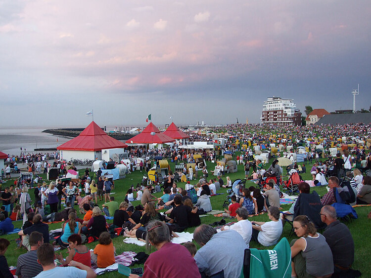 Tausende von Menschen – Einheimische und Urlauber – machen sich an diesem Abend auf den Weg, um sich ihren Platz in der Grimmershörnbucht zu sichern. Bis spät in die Nacht kann auf dem Festgelände vor den Bühnen bei Livemusik gefeiert werden.
