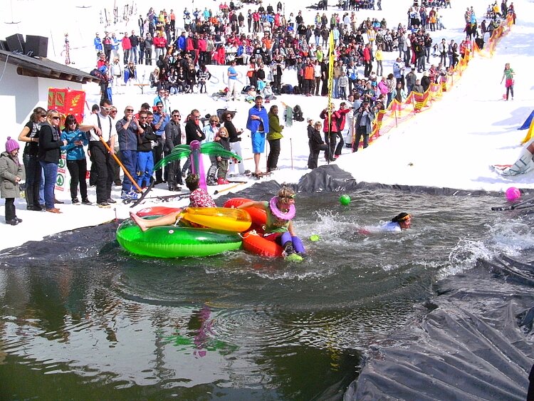 Neben der „Crazy Vehicle“-Kategorie dürfen Mutige auch auf Skiern oder Snowboards ihr Glück versuchen. Sieger ist, wer den künstlich im Skigebiet angelegten Eiswasser-Teich trockenen Fußes überquert. Für Bauweise, Größe und Design ist alles erlaubt, was gefällt – aber je ausgefallener das Ergebnis, desto größer ist die Chance, das Publikum und die Jury für sich zu gewinnen. Wer selbst eine zündende Idee hat und mutig genug ist, am Watersurf-Contest teilzunehmen, kann sich – mit Wechselkleidung ausgerüstet– direkt am Start anmelden.