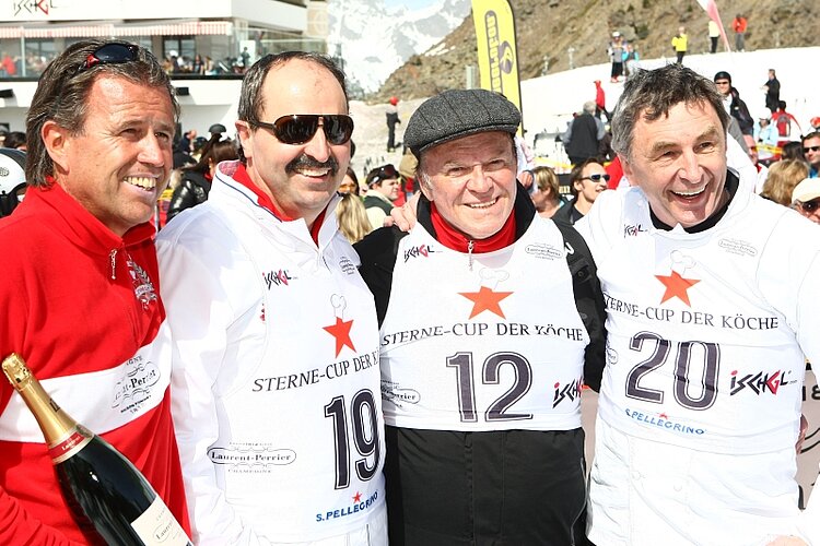 Thomas Schreiner mit den Starköchen Johann Lafer, Heinz Winkler und Hans Haas nach dem Riesenslalom (Foto: TVB Paznaun - Ischgl / Arno Fischer)
