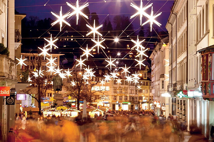 „Sternenstadt" – so bezeichnen die St. Galler ihre Heimatstadt während der Adventszeit. Dann funkeln 700 Sterne über der Altstadt und hüllen die historischen Fassaden der Unesco-Welterbestadt in festlichen Glanz. Ein lohnenswerter Anblick ist auch die mit 18.000 Lampen geschmückte Riesentanne im Stiftsbezirk. Am vierten Advent findet hier das Adventssingen für jedermann statt. Dann singt man in St. Gallen Weihnachtslieder und das Klostergelände verwandelt sich in ein Lichtermeer. Beim Adventskalender in Rorschach unterhalten lokale Solokünstler und Gruppen täglich um 18.30 Uhr ihr Publikum.