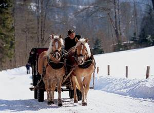 Etwas gemächlicher, aber dafür nicht weniger romantisch, erkunden Gäste das Werdenfelser Land in einem Pferdeschlitten. Vor der einzigartigen Kulisse des Wettersteingebirges entpuppt sich die Fahrt in einem stilvollen Gespann der Lohnkutscher Vereinigung Garmisch-Partenkirchen als märchenhaftes Erlebnis. Klare Luft, die Stille der Natur und das sanfte Klingeln des Pferdegeschirrs erinnern die warm eingemummelten Fahrgäste an den Charme längst vergangener Zeiten.